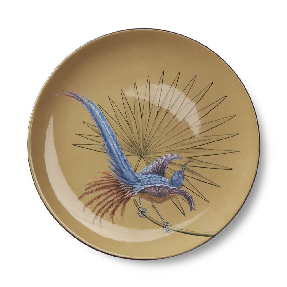 Birds of Paradise inspired the Paradise series. Six different Birds of Paradise with vibrant plumage perch on palm fronds. Each plate is in a different color and style.